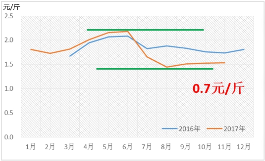 ??从图可以看出,2017年苹果下市后,价格比去年同期略低,截止到2017年11月初,苹果产地均价与去年同期相比,下跌幅度大概在0.2-0.3元/斤。2017年苹果价格进入下滑的主要原因在于:因前几年苹果市场行情不稳定,在苹果上市时期,市场收货积极性不高,采购商主要以观望为主,苹果价格相对往年有所降低。